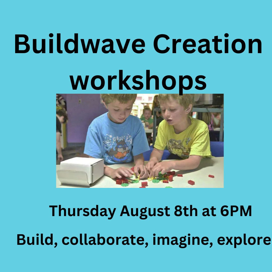Two programs from last year are back. Last year Jim Hubert created boats kid kids to assemble and paint, and this year we have a new design. Join Jen to create your own special boat. We are also excited to have BuildWave back to excite all our creators with a fun new program. The workshop filled last year, so this is another chance. Please Join us!